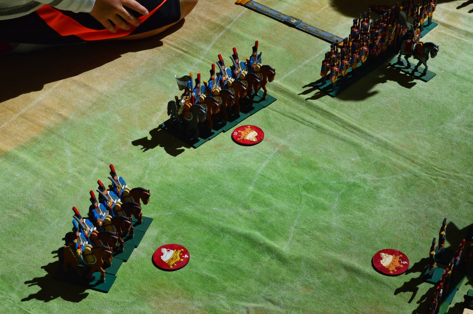 After finishing up the Bolt Action game it was time for dinner and beers before we played several games of "Bang!" before setting up for the Friday night flea market (I sold everything I brought and did very well). Off to bed at about 1am. 7am wakeup, some breakfast then it was time to run my Napoleonic Black Powder game at 9am. For this game we played a meeting engagement that was a fictional encounter of an encounter between advancing Prussian (and British) forces after Waterloo running into the 30,000 men of Grouchy's corps. We had 8 players - four on each side and each running a brigade of 5-7 units. It was a close run game and at the end of the day the Prussians/British pulled off a narrow victory by reaching the pre-designated army break level of the French army (9 units broken). Pictures below.